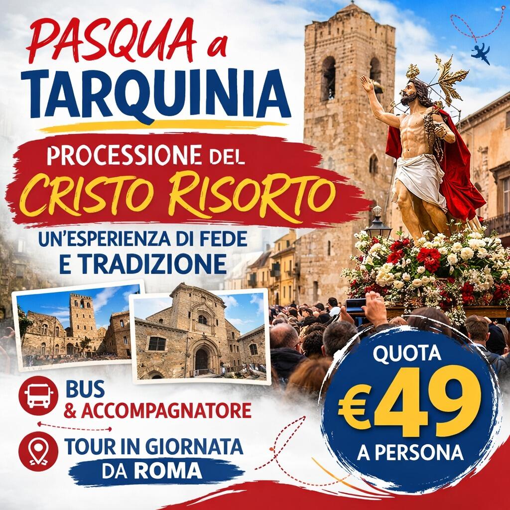 Incontro dei partecipanti nei luoghi ed orari convenuti, sistemazione in pullman GT e partenza per Tarquinia in tarda mattinata, affascinante città della Tuscia ricca di storia, arte e tradizioni. Arrivo e tempo a disposizione per passeggiare nel centro storico, tra vicoli medievali, piazze caratteristiche e scorci panoramici. Pranzo libero. Nel pomeriggio proseguimento della visita libera della città e tempo per vivere l’atmosfera della Pasqua tarquiniese, una delle più suggestive del Lazio. A seguire partecipazione alla tradizionale Processione del Cristo Risorto, evento simbolo della Domenica di Pasqua a Tarquinia, conosciuto anche come il Cristo che corre: una celebrazione intensa e coinvolgente che richiama ogni anno numerosi visitatori. Al termine della manifestazione, ritrovo dei partecipanti e partenza per il rientro. Arrivo previsto in serata.