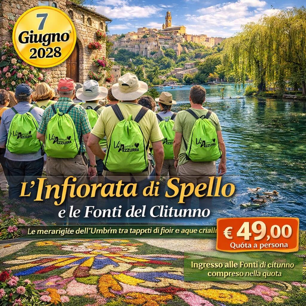 Ritrovo dei partecipanti nei luoghi concordati e partenza in pullman G.T. per l’Umbria. Arrivo a Spello, uno dei borghi più belli e caratteristici della regione, celebre per le sue atmosfere autentiche e per la straordinaria manifestazione delle Infiorate, che si svolge ogni anno in occasione della festività del Corpus Domini. In questa giornata speciale il centro storico si trasforma in un vero spettacolo a cielo aperto: gli infioratori lavorano per tutta la notte realizzando meravigliosi tappeti e quadri floreali lungo le vie del borgo, utilizzando esclusivamente petali, foglie ed elementi vegetali naturali, senza coloranti artificiali. Il risultato è un percorso di circa un chilometro e mezzo, ricco di colori, dettagli artistici e composizioni di grande impatto, pensato per onorare il passaggio della processione del Corpus Domini. Tempo libero per passeggiare tra le vie di Spello, ammirare le infiorate, scoprire gli scorci più suggestivi del borgo e per il pranzo libero. Nel primo pomeriggio proseguimento per le Fonti del Clitunno, luogo di rara bellezza naturale nel cuore dell’Umbria. Passeggiata all’interno di questo incantevole parco, caratterizzato da un laghetto di acqua limpida e cristallina, circondato da salici, pioppi e vegetazione lussureggiante. Le acque sorgive che alimentano il lago, i piccoli ruscelli e la presenza di uccelli acquatici rendono questo luogo un piccolo paradiso naturalistico, noto fin dall’antichità per la sua atmosfera serena e rigenerante. Al termine della visita, partenza per il rientro con arrivo previsto in serata.